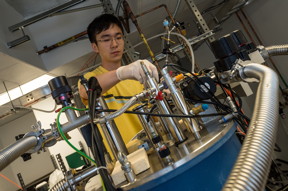 | Researchers at Rice University, including graduate student Xinwei Li, have observed and measured a Bloch-Siegert shift in strongly coupled light and matter in a vacuum. The project could aid in the development of quantum computers. (Credit: Jeff Fitlow/Rice University) |