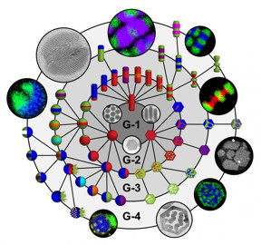 | A new mix-and-match toolkit allows researchers to create a library of complex nanoparticles that could be used in medical, energy, and electronic applications. First-generation (G-1) spheres, rods, and plates transform into 47 increasingly sophisticated higher-generation (G-2, G-3, G-4) particles through sequences of chemical reactions. In the image, each color represents a distinct type of material, and electron microscope images are shown for several types of particles. CREDIT Schaak Laboratory, Penn State |