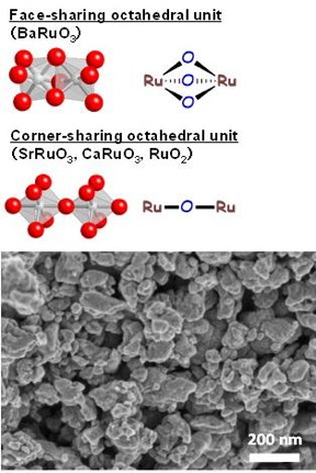 | Top: Schematic representations of the face-sharing unit in rhombohedral BaRuO3 and corner-sharing unit in tetragonal RuO2, cubic SrRuO3, and orthorhombic CaRuO3. Bottom: Scanning electron microscope (SEM) image of BaRuO3. CREDIT Keigo Kamata |