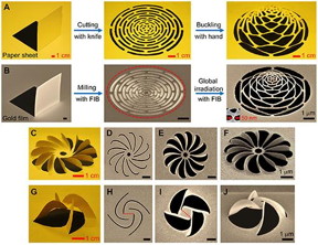 | Macroscopic paper-cuts in a paper sheet and nano-kirigami in an 80-nm thick gold film. CREDIT Institute of Physics |