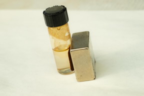 | Rice University engineers have developed magnetic nanoparticles that separate the last droplets of oil from produced water at wells. The particles draw in the bulk of the oil and are then attracted to the magnet, as demonstrated here. CREDIT Jeff Fitlow/Rice University |