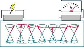 | An electrical current in a platinum wire (l.) creates a magnetic wave in the antiferromagnetic iron oxide (red and blue waves) to be measured as a voltage in a second platinum wire (r.). The arrows represent the antiferromagnetic order of the iron oxide. CREDIT Ill./©: Andrew Ross |