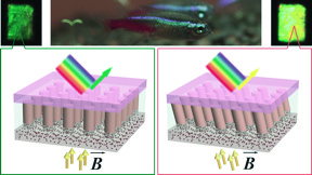 When a vertical magnetic field is applied beneath the substrate, it pulls the floating nanoparticles into columns, aligned over the pedestals. By changing the orientation of the magnetic field, researchers can change the orientation of the nanoparticle columns. Changing the angle of the columns shifts the wavelength of light that is most strongly reflected by the material; in practical terms, the material changes color.