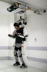 Since the operation, the patient has spent 27 months performing various types of exercises to practice controlling the exoskeleton. He practices in virtual environments with the exoskeleton avatar at home three times a week and works directly with the exoskeleton at Clinatec one week every month. When fitted with the suspended exoskeleton, he is able to take several successive steps and control his two upper limbs in three dimensions. He also can rotate his wrists while sitting or standing.