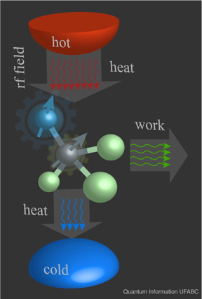 “Fast operation of this molecular machine produces transitions between the spin energy states, which are related to what scientists in the area call ‘quantum friction’ that reduces performance. This kind of friction is also associated with an increase in entropy. On the other hand, a very slow operation (that decreases quantum friction) will not deliver a considerable amount of extracted power”, as pointed out by John Peterson from the University of Waterloo. So, the best scenario is to conciliate some amount of power with low levels of quantum friction or entropy production, in a similar way of what modern engineering does in cars engines. In the new reported experiment, the tiny spin engine reaches an efficiency close to its thermodynamic limit at maximum power, which is much better than what car engines can do nowadays. “The quantum spin engine would not be very useful in practice since the work produced would supply a very small amount of energy to radio waves. It would only be sufficient to alter another nuclear spin. The research team is more interested in measuring how much energy it uses, how much heat it dissipates, and how much entropy is produced during operation. Another goal is to learn, in real experiments, how to optimize the operation of small quantum thermal machines and eventually build better quantum refrigerators to applications in quantum technology” explain Roberto Serra from the Federal University of ABC. The technique applied in this experiment has great potential for further developments in the emerging quantum thermodynamics.