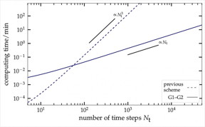 | Computing time required for the new G1-G2 method (solid line) as a function of the process duration, compared to the traditional method (logarithmic scale). CREDIT Niclas Schlünzen, AG Bonitz |