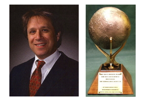 The Pioneer Award consists of a silvery pewter Moon globe cast by the Baker Art Foundry in Placerville, CA, from a sculpture created by well-known astronomical artist Don Davis. The globe, which represents multiple space destinations and goals, sits freely (unattached) on a brass support with a wooden base capped with a black granite inlay, both of which are created by renowned sculptor Michael Hall of Studio Foundry of Driftwood, TX. The brass plaque on the base is created by Art Hall Awards of Austin.