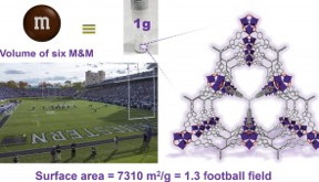 Adsorbents are porous solids which bind liquid or gaseous molecules to their surface. Thanks to its nanoscopic pores, a one-gram sample of the Northwestern material (with a volume of six M&Ms) has a surface area that would cover 1.3 football fields.
