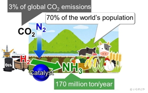 | Ammonia (NH3) is one of the most important industrial chemicals today, synthesized globally for use in fertilizers that then enable food production for approximately 70% of the world’s population. Ammonia is currently obtained by reacting nitrogen (N2) from air with hydrogen (H2). This reaction requires high energy and is, therefore, powered by fossil fuels, contributing to over 3% of the global CO2 emissions. |