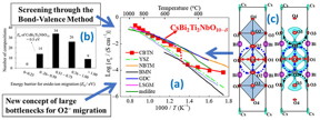 | Figure 1. The mechanism, design concept, and structural characteristics that afford high oxide-ion conductivity in CsBi2Ti2NbO10-δ (a) The oxide-ion conductivity of CsBi2Ti2NbO10-δ is higher than those of many materials reported previously. (b) By screening sixty-nine potential materials using the bond-valence method, CsBi2Ti2NbO10-δ was selected. A new design concept for its high oxide-ion conductivity is proposed: enlarged bottlenecks. (c) Structure of CsBi2Ti2NbO10-δ (left) and the bond-valence-based energy landscape for an oxide ion at 0.6 eV (right), which marks all the possible oxide-ion migration paths. The bottlenecks for oxide-ion migration are enlarged in CsBi2Ti2NbO10-δ. |