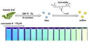 Organophilic carbon nanodots (CNDs) were synthesized in acetone from organic extract of natural plant leaves. The CNDs showed multi-band emission, and could be well dispersed in acetone and ethanol. Taking advantage of their structural and optical properties, the CNDs were used as a ratiometric and colorimetric sensor for curcumin detection in ethanol.
