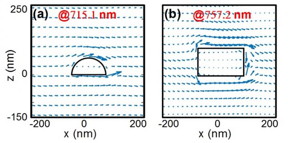 | An energy flux propagates along a surface and bypasses the nanoparticle at SLR. The hemisphere shape introduces weaker perturbations than the rod shape, resulting in much lower loss and a much higher quality factor. CREDIT SIAT |