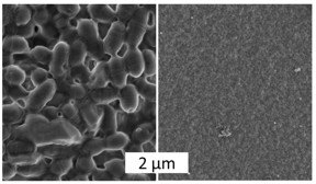 | Scanning electron microscope images give overwhelming proof of the difference. Left: A biofilm forms on the surface of polycaprolactone, a biodegradable plastic frequently used in medicine. Right: Spider silk does not allow for biofilm formation. CREDIT Images: Gregor Lang. |