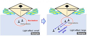 To this end, Professor Atsutomo Nakamura's group at Nagoya University, Japan, and Dr. Xufei Fang's group at the Technical University of Darmstadt have developed a technique for quantitatively studying the effect of light on nanoscale mechanical properties of thin wafers of semiconductors or any other crystalline material. They call it a "photoindentation" method. Essentially, a tiny, pointy probe indents the material while it is illuminated by light under controlled conditions, and the depth and rate at which the probe indents the surface can be measured. The probe creates dislocations - slippages of crystal planes - near the surface, and using a transmission electron microscope the researchers observe the effect of light at a range of wavelengths on dislocation nucleation (the birth of new dislocations) and dislocation mobility (the dislocations' gliding or sliding away from the point where they were created). The nucleation and mobility are measured separately for the first time and is one of the novelties of the photoindentation technique.