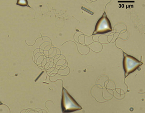 | Droplets with tail-like filaments. Credit: Emily Lin. |