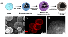 Conventional catalysts are typically synthesized via pyrolysis, wherein transition metal precursors and carbon are mixed at 700–1000℃. However, due to metal aggregation and a low specific surface area, the catalysts obtained through this process had a limited activity. Accordingly, researchers have focused on synthesizing single-atomic catalysts; however, previously reported single-atomic catalysts can only be produced in small quantities because the chemical substances and synthesis methods used varied depending on the type of the synthesized catalyst . Therefore, research has focused on performance improvement of the catalyst rather than the manufacturing process.