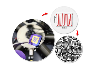 | The image of the fabricated electronic chip that generates the random number. The chip is loaded into the measurement setup, where the randomness of the electron trapping/de-trapping is converted into binary outputs. CREDIT Nithin Abraham |