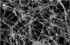 | A tangle of unprocessed boron nitride nanotubes seen through a scanning electron microscope. Rice University scientists introduced a method to combine them into fibers using the custom wet-spinning process they developed to make carbon nanotube fibers. (Credit: Pasquali Research Group/Rice University) |
