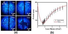 In order to study the formation mechanisms of femtosecond-LIPSs, scanning electron microscopy (SEM) and atomic force microscopy (AFM) are typically used to observe the LIPS morphology. The resolutions of these methods are very high, however, they cannot be used to study the dynamics of LIPS formation. Prof. Jia’s group reported a collinear pump-probe imaging method to study the transient processes of LIPS formation. The spatial resolution is 300 nm and the temporal resolution is 0.6 ps. Figure 1(a) shows the evolution of the LIPSs formed on an Au film irradiated by single pulse of 800 nm, 50 fs laser. Between 400 and 600 ps, transient LIPSs appear to be very distinct and regular. The ripples are perpendicular to the laser polarization with a period of 740 ± 10 nm. However, the ripples disappear after the solidification of the ablation spot.