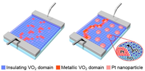 The research team succeeded in increasing the switching efficiency of the device by using platinum nanoparticles. When voltage was applied to a device, an electric current “skipped” through these particles and a rapid phase transition occurred.