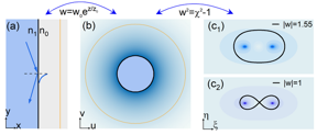 | Mapping the homogeneous refractive index distribution in the original straight space (a) to a circular OBH cavity (b) with gradient index. The core region of OBH cavity is truncated as homogeneous index. The quadrupole cavity (c1) and peanut-like cavity (c2) is transformed from the circular OBH cavity under different structural parameters. CREDIT by Qingtao Ba, Yangyang Zhou, Jue Li, Wen Xiao, Longfang Ye, Yineng Liu, Jin-hui Chen and Huanyang Chen |