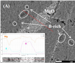 | Scientists at SIT and University of Normandie developed bulk MgB2 with promising superconductivity. This picture shows unreacted magnesium oxide and boron in the matrix of MgB2, and the inset shows energy dispersive x-ray spectroscopy curves for boron, oxygen, and magnesium. CREDIT Muralidhar Miryala from SIT, Japan and Prof. Jacques G. Noudem from UN, France |