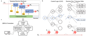 | a, the hardware of a general quantum receiver composed of N rounds of processing. The jth processing round entails a variational quantum circuit represented by the unitary operation U ̂_j configured by the parameter set α_j, ancillary states ρ ̂_(s_j ), and measurement apparatus M_j. b, the control logic comprised of a decision tree and a decision table. Blue lines show one possible path toward the output. Quantum-receiver output y is determined by the sequence of measurement outcomes, tied to a unique path in the decision tree. c, the QREAL formulator consisting of four modules (clockwise) as one iteration in the learning process. The control logic optimized by the QREAL formulator is compiled and built into the classical processor. CREDIT by Chaohan Cui, Zheshen Zhang |