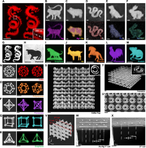 | (A) Fluorescent image of two dragons of CdSe QDs without shrinking; the inset shows a resolution of ~200 nm. (B-F) SEM (top) and EDX (bottom) images of a monkey of Ag; pig of Au-Ag alloy; snake of TiO2; dog of Fe3O4; and rabbit of NaYREF4, respectively. (G) Designed dragon patterns in (A). (H) Optical microscopy image of an ox of diamond. (I-M) Fluorescent images of a tiger of graphene QDs; goat of fluorescent Au; horse of polystyrene; rooster of fluorescein; and mouse of fluorescent protein, respectively. (N-R) 3D models and fluorescent images (maximum-intensity projection) of the fabricated structures in shapes of a C60 molecule, regular dodecahedron, regular octahedron, cube, and regular tetrahedron of different materials, respectively. (S) Top view of a five-layer split ring resonator (SRR) structure; inset: SRR unit; and (T) trimetric view of the SRR structure; inset: slice view of an SRR unit. (U) SEM image of the top layer of an SRR structure after shrinking and dehydration. (V) 3D model of a woodpile structure containing 16 vertical rods along the z-axis. (W, X) SEM cross-sectional images of the fabricated woodpile at the two cut planes in (V), respectively. (Substrate tilt angle: 52°). Scale bars are 1 µm for (B-F, U, W, X, and the insets of S and T); and 10 µm for (A, H-M, N-T). CREDIT Chinese University of Hong Kong |