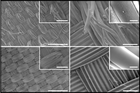 | Images of uncoated (top left, right) and coated (bottom left, right) nylon-6,6 fabrics after nine washing cycles taken by a scanning electron microscope. CREDIT Image: Sudip Lahiri |