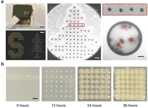 | Details of the printed dots on a gold-coated slide (a) where false coloring in the close-up of a single dot shows red blood calls in red and Staphylococcus epidermidis bacteria in blue. The researchers also printed onto an agar-coated slide (b) to show how the dots fare under incubation. CREDIT Fareeha Safir |
