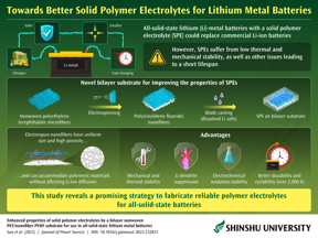 “Considering the poor cycling performance (charge-discharge cycles) of SPEs stemming from low mechanical and thermal properties, this project focused on the fabrication of SPEs reinforced by a bilayer substrate comprised of a layer of PET nonwoven fabric and a layer of PVDF nanofibers to improve the structural stability and thus the cycle performance of SPEs,” said Ick Soo Kim, corresponding author of the study and professor at the Nano Fusion Technology Research Group in the Institute for Fiber Engineering (IFES) at Shinshu University. Importantly, SPEs made up of polymer matrices and lithium salts demonstrate properties such as flexibility and processability that are compatible with LMB electrodes. The electrospinning method also eliminates the folds and voids generated by the pressing method between the PET and PVDF layers, providing a simple, easy and adaptable manufacturing method for nanofiber membranes.