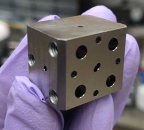 | A niobium superconducting cavity. The holes lead to tunnels which intersect to trap light and atoms. CREDIT Aishwarya Kumar |