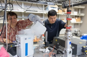 | Giti Khodaparast (at left) and Wei Zhou in the Nonlinear Spectroscopy Lab in ICTAS II on Virginia Tech's Blacksburg campus. Photo by Chelsea Seeber for Virginia Tech. |