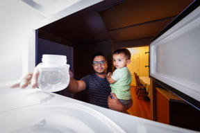 | Kazi Albab Hussain (left) holds his son while removing a plastic container of water from a microwave. Hussain and colleagues at the University of Nebraska–Lincoln have found that microwaving such containers can release up to billions of nanoscopic particles and millions of microscopic ones. CREDIT Craig Chandler, University of Nebraska–Lincoln |