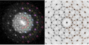 | A mathematical tool called a fast Fourier transform maps the structure in a way that reveals the 12-fold symmetry of the quasicrystal. The fast Fourier transform of the electron microscope image of the quasicrystal is shown on the left, while the transform of the simulated crystal is shown on the right. Credit: Mirkin Research Group, Northwestern University, and Glotzer Group, University of Michigan. |