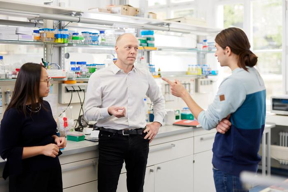 | Professor Tim Liedl with PhD Student Xin Yin (left) and Postdoc Gregor Posnjak (right) in the lab CREDIT Stephan Hoeck / LMU |