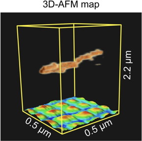 Fukuma and colleagues then performed experiments with a carbon nanotube fiber suspended above a regular pattern of nano-sized platinum dots deposited on a silicon substrate. The measurements were done in dynamical mode. The reconstructed 3D map of the scanned volume clearly showed the fiber and the dots below it, underlining the capability of 3D-AFM to image vertically overlapping nanostructures.