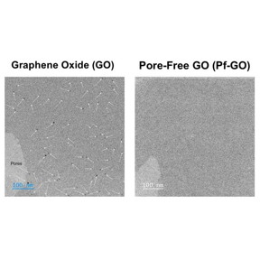 | Numerous pores were observed in GO (indicated by white arrows). In contrast, no pores were visible in Pf-GO, even under high magnification. Credit Kazuto Hatakeyama and Shintaro Ida from Kumamoto University |