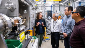 | From left: Physicist and Group Leader Shelly Kelly describes the unique monochromator in the recently upgraded 25-ID beamline at the APS to Senior Chemist Zonghai Chen, Postdoc Jiyu Cai and Physicist Zhan Zhang. Credit (Image by Argonne National Laboratory/Mark Lopez.) |