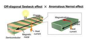 3. This research team recently developed an artificially tilted multilayer composed of alternating layers of a magnetic metal and semiconductor to simultaneously exhibit both the off-diagonal Seebeck effect (ODSE) and ANE (see Figure). Here, ODSE realizes the transverse thermoelectric conversion arising from tilted multilayer structures without the need for external magnetic fields or magnetization. The team demonstrated that the dimensionless figure of merit for ANE in the artificial material was improved by more than one order, compared to that of the same single magnetic metal alone, owing to the synergetic action of ANE and ODSE. These findings indicate that factors, such as certain physical parameters and structures, which have not been the focus of previous studies on ANE, are important for improving the performance of transverse thermoelectric conversion.