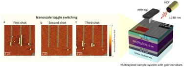 Illumination with single laser pulses can be used to locally switch the magnetization at the edge of the nanostructure (Fig. 1(a)). Furthermore, a region where the magnetization has been switched by the laser pulse can be reverted with another single laser pulse (Fig. 1(b)) at precisely targeted locations on the magnetic material. It is thus possible to realize a controlled toggling of the magnetization, as required to encode information states “0” and “1”. The final magnetic state was visualized using magnetic force microscopy (MFM), a scanning technique that can image the magnetic state of a sample with nanometer scale spatial resolution.