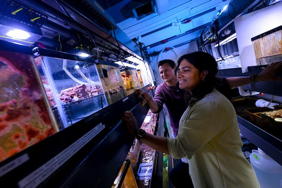 | UC San Diego's Daniel Wangpraseurt and Samapti Kundu monitor coral growth in an experimental aquarium at Scripps Institution of Oceanography. Credit Must credit Erik Jepsen/UC San Diego |