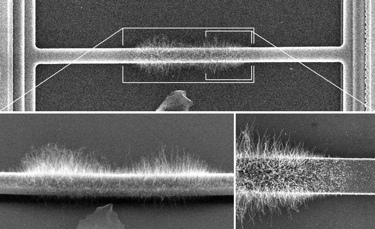 The researchers passed the current through a wire to the specific locations on the microstructure where they wanted the nanowires or nanotubes to grow. In one experiment, an area was heated to 700 degrees Celsius while another spot just a few micrometers away sat comfortably at 25 degrees Celsius. The entire circuit board was placed in a vacuum chamber for the tests.